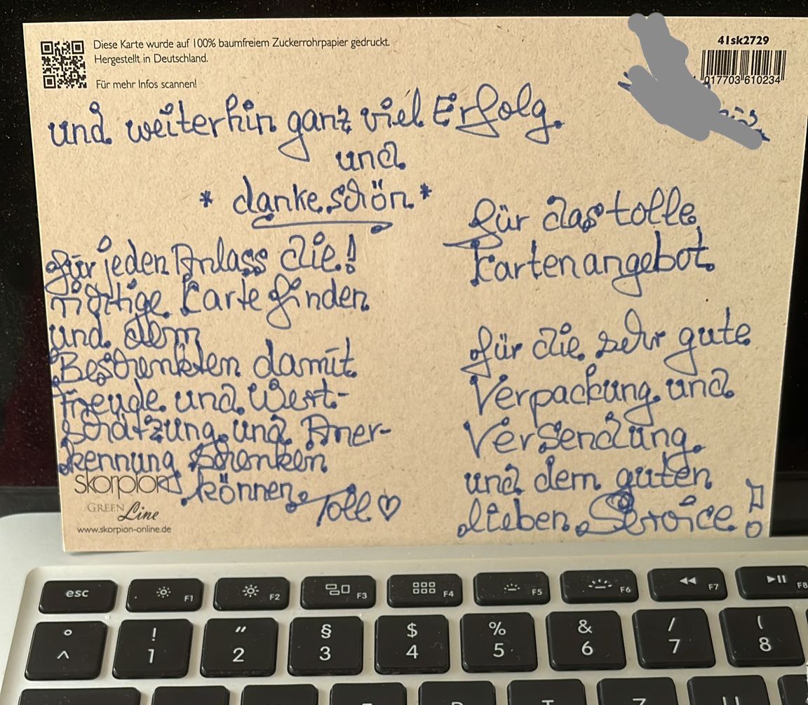 Gegründet haben wir Grusskartenladen.de im Jahr 2013 – aus dem Wunsch heraus, etwas Eigenes mit Herzblut zu schaffen und Kartenliebhabern in ganz Deutschland einen besonderen Online Shop zu bieten. Was uns antreibt? Unsere Liebe zu besonderen Kartenideen, die Geschichten erzählen, Freude bereiten und von Herzen kommen. Deshalb steckt auch in unserem Logo ein Herz – es steht für unsere Begeisterung, unser Engagement und für die Menschen, die hinter jeder Karte stehen. Ob Kunden, Lieferanten oder Partner: Faires und ehrliches Miteinander ist uns genauso wichtig wie die Vermeidung von Nachahmer-Produkten. Wir stehen für Originalität, Qualität und Authentizität.