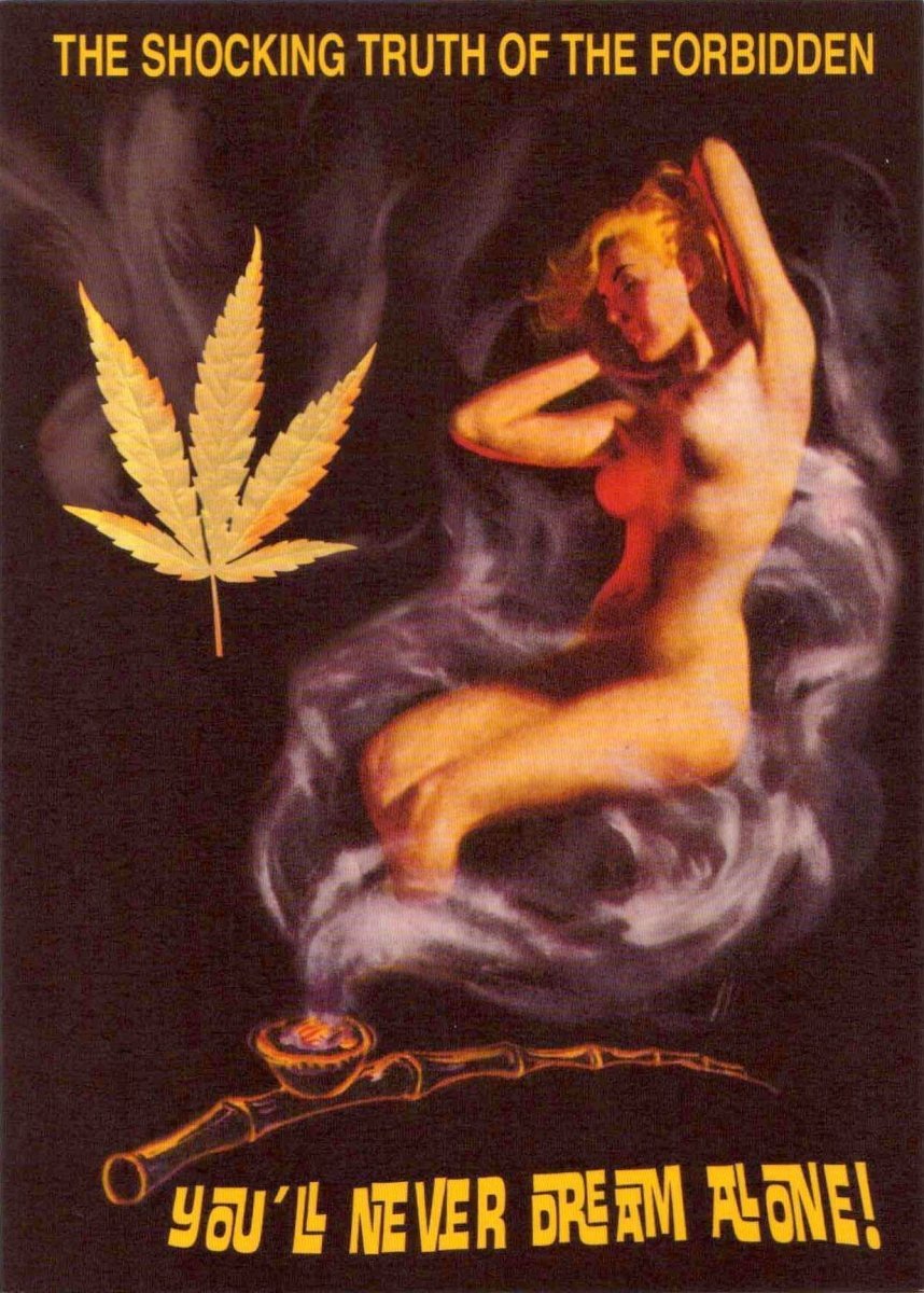 Blanko-Postkarte – Kunstmotiv Rauchende Frau mit Blatt & Zigarette in Schwarz, Rot, Gelb – 'Alone' Text