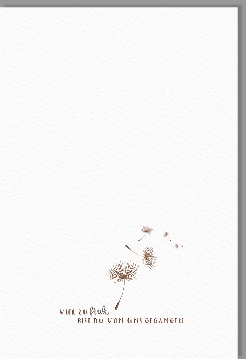 Trauerkarte mit Pusteblumenmotiv – "Viel zu früh bist du von uns gegangen" für stilvolle Beileidsbekundungen