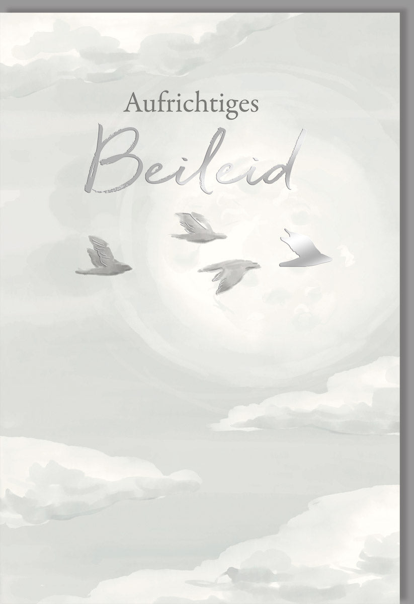 Trauerkarte mit Vögel & Wolken - Elegante Kondolenz auf Naturkarton, Silberfolie & Blindprägung, Dezenter Abschied in Grau für Erwachsene und Senioren